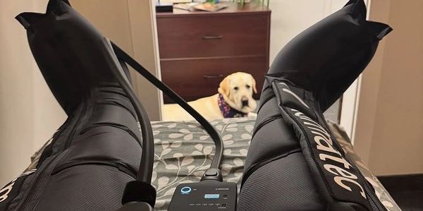 Have you tried our Compression Therapy? The Normatec (by Hyperice) is used for recovery, leg cramping, edema (swelling), and to help prevent tightness and muscle aches . Our patients have loved using it for pregnancy related leg swelling, knee pain, ankle pain, sports injuries, and so much more! Kobe might even hang out with you while you relax during your session!